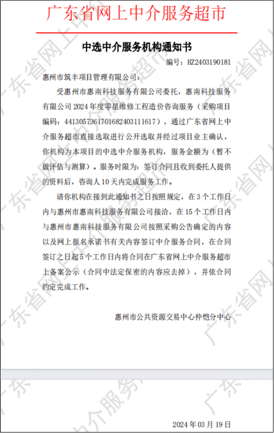 中選中介服務機構通知書(惠南科技公司2024年度零星維修工程造價咨詢服務)