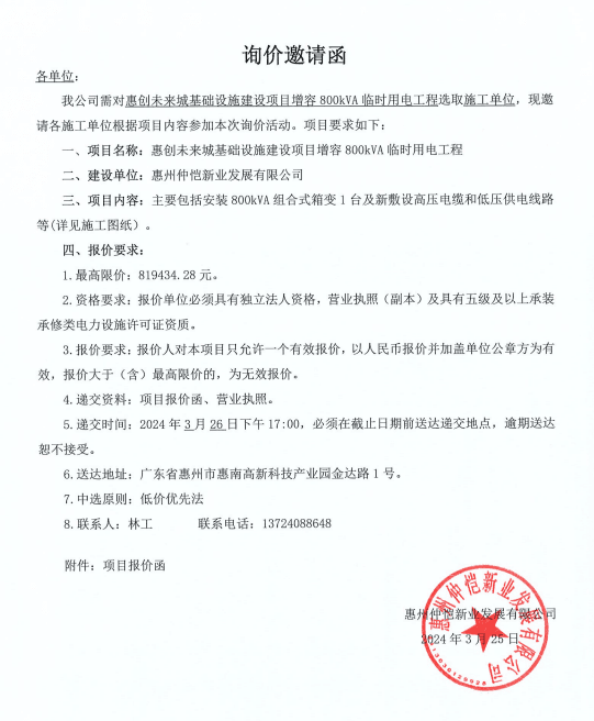 【招標(biāo)公告】惠創(chuàng)未來城7400kVA配電工程