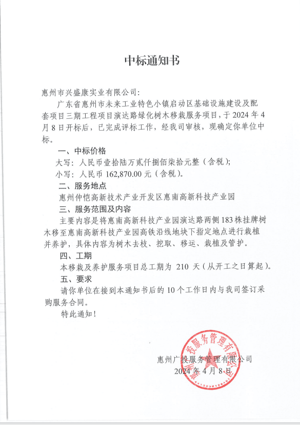 【中標(biāo)通知】廣東省惠州市未來工業(yè)特色小鎮(zhèn)啟動(dòng)區(qū)基礎(chǔ)設(shè)施建設(shè)及配套項(xiàng)目三期工程項(xiàng)目演達(dá)路綠化樹木移栽服務(wù)