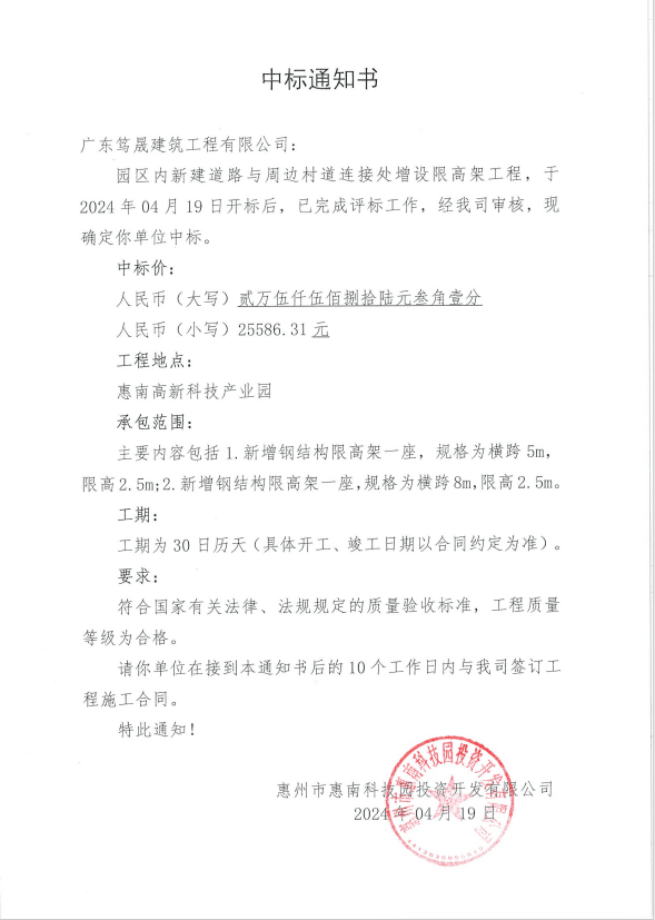 【中標(biāo)通知】園區(qū)內(nèi)新建道路與周邊村道連接處增設(shè)限高架工程