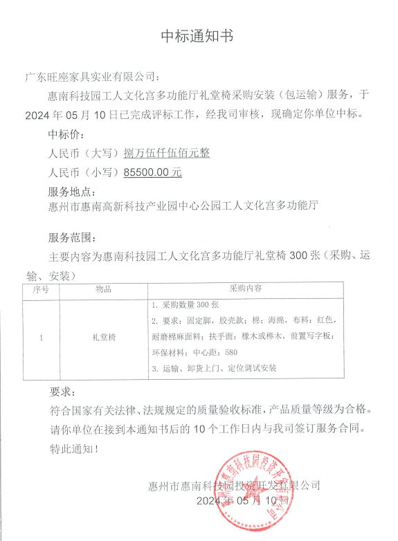 【中標(biāo)通知】惠南科技園工人文化宮多功能廳禮堂椅采購安裝(包運(yùn)輸)服務(wù)