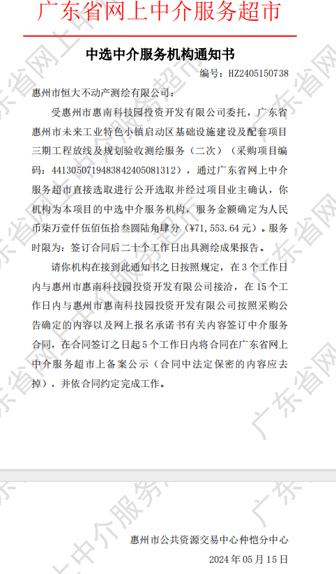 【中選公示】廣東省惠州市未來工業(yè)特色小鎮(zhèn)啟動區(qū)基礎設施建設及配套項目三期工程放線及規(guī)劃驗收測繪服務(二次)