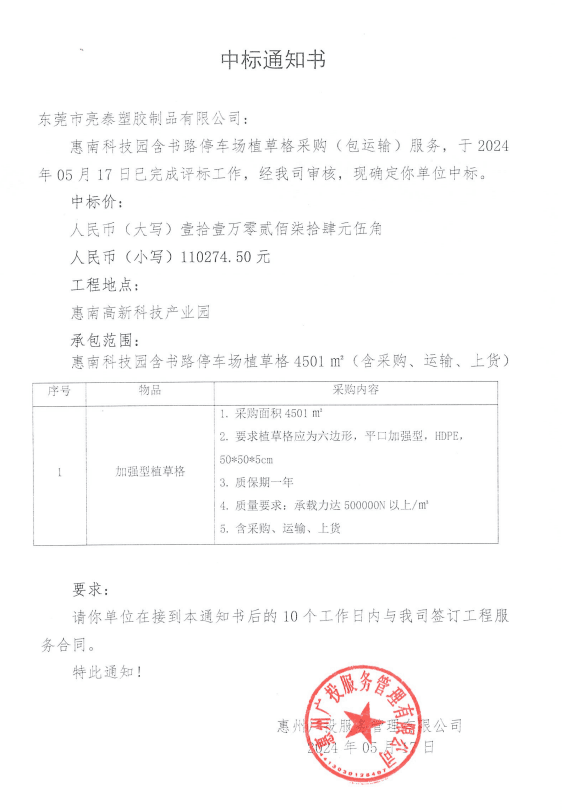 【中標通知】惠南科技園含書路停車場植草格采購(包運輸)服務(wù)
