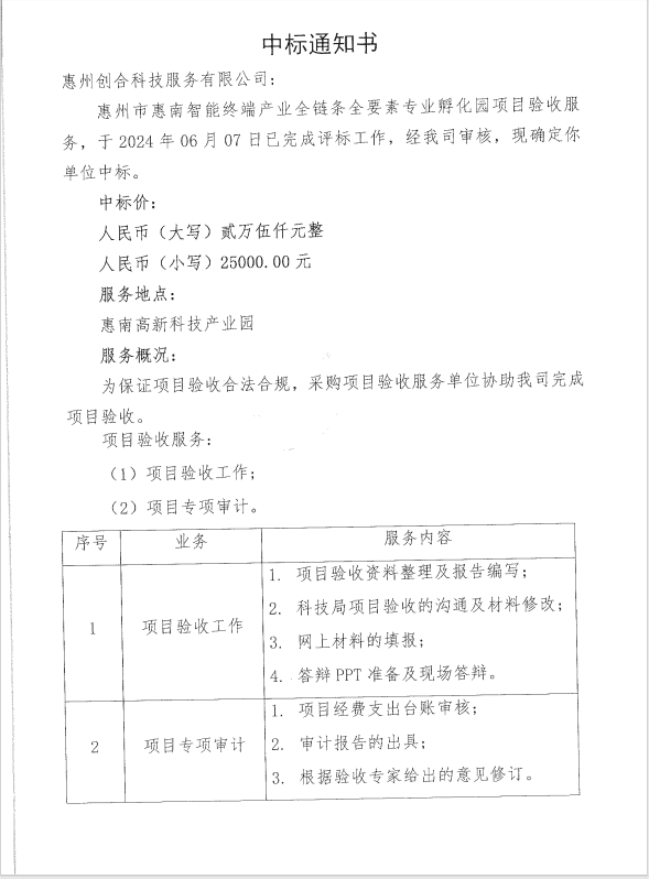 【中標通知】惠州市惠南智能終端產(chǎn)業(yè)全鏈條全要素專業(yè)孵化園項目驗收服務