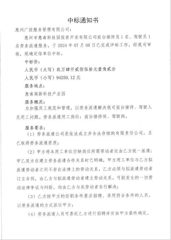 【中標(biāo)通知】惠州市惠南科技園投資開發(fā)有限公司前臺接待員1名、駕駛員1 名勞務(wù)派遣服務(wù)
