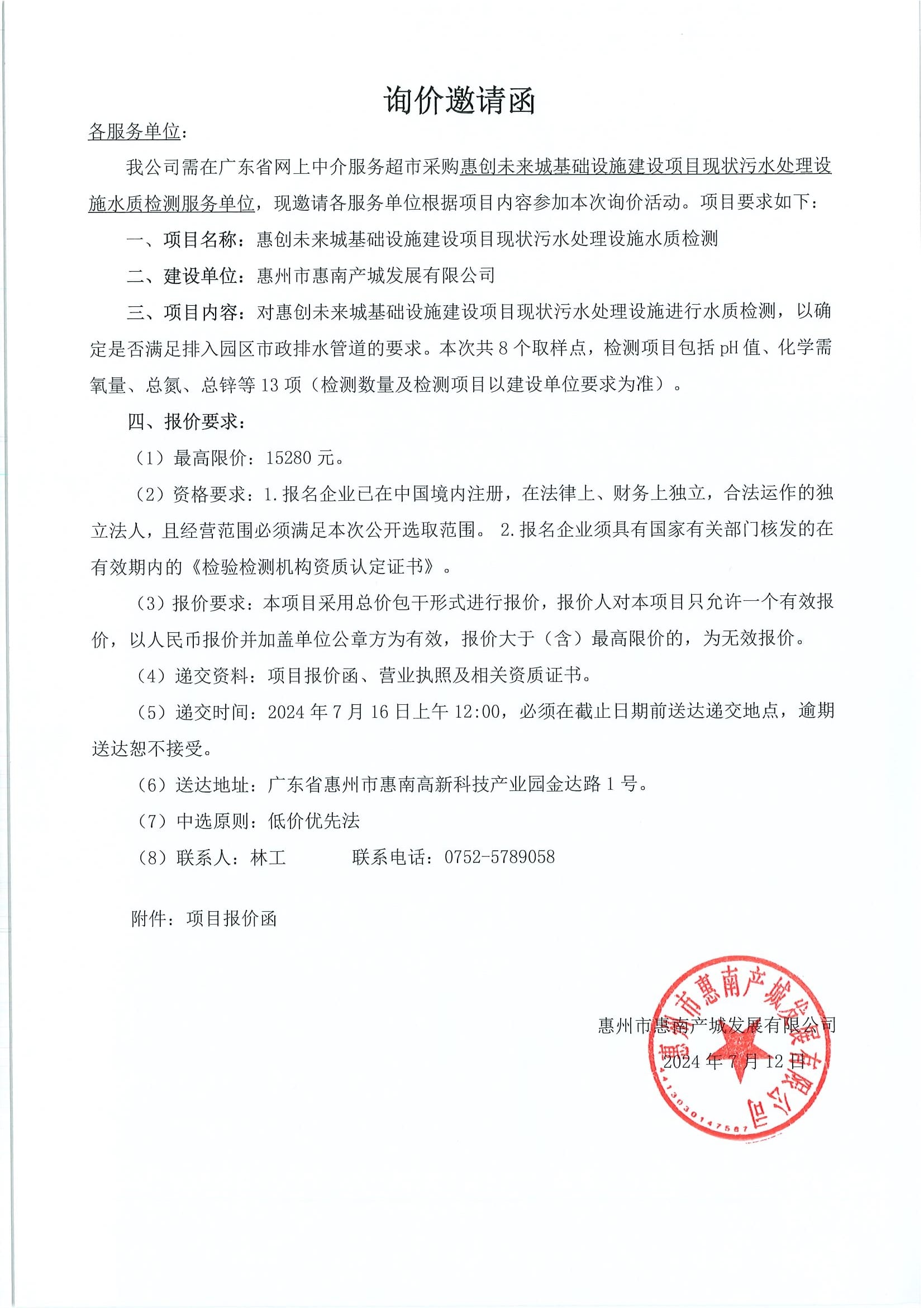 惠創(chuàng)未來城基礎(chǔ)設(shè)施建設(shè)項(xiàng)目現(xiàn)狀污水處理設(shè)施水質(zhì)檢測詢價(jià)邀請函