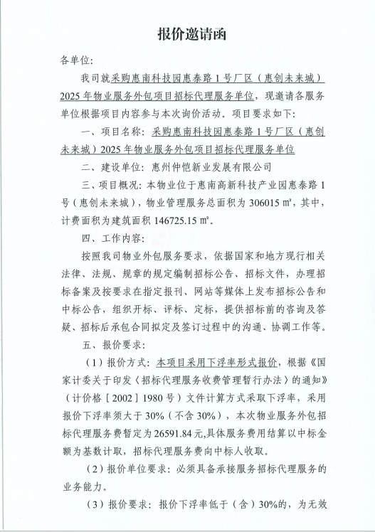 采購惠南科技園惠泰路1號廠區(qū)(惠創(chuàng)未來城) 2025年物業(yè)服務外包項目招標代理服務單位