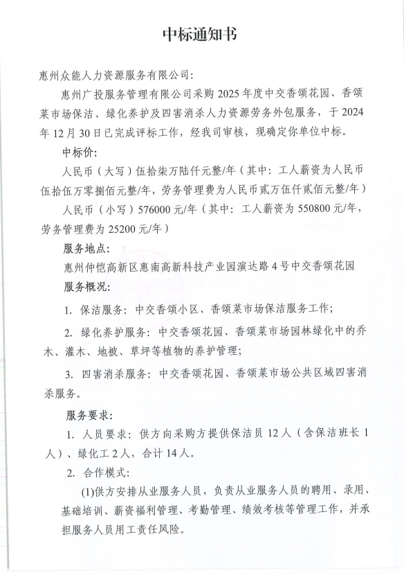 【中標(biāo)通知】采購2025年度中交香頌花園、香頌菜市場保潔、綠化養(yǎng)護及四害消殺人力資源勞務(wù)外包服務(wù)