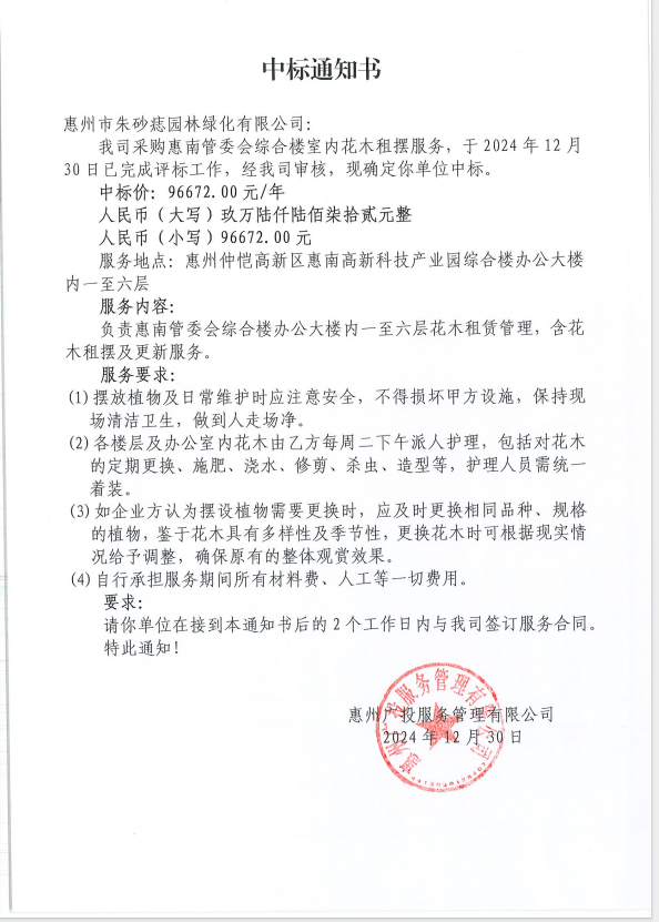 【中標(biāo)通知】采購惠南管委會綜合樓室內(nèi)花木租擺服務(wù)
