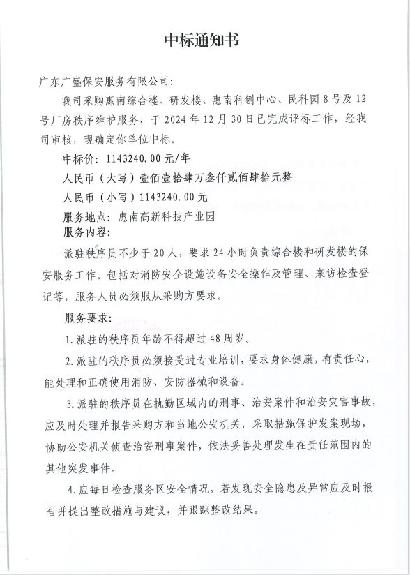 【中標通知】采購惠南綜合樓、研發(fā)樓、惠南科創(chuàng)中心、民科園8號及12號廠房秩序維護服務
