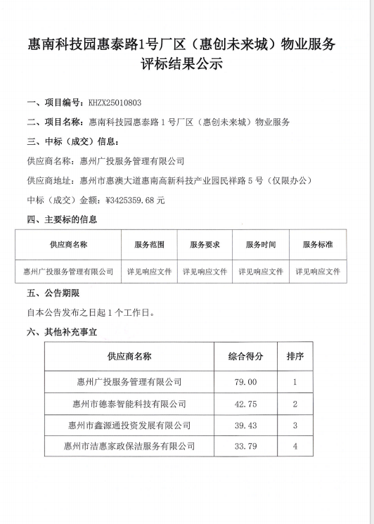 惠南科技園惠泰路1號廠區(qū)(惠創(chuàng)未來城)物業(yè)服務(wù)評標(biāo)結(jié)果公示