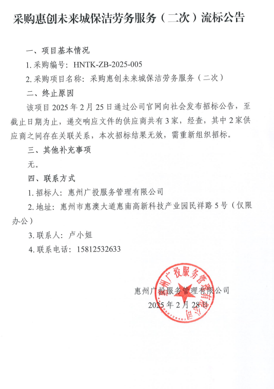 【招標(biāo)公告】采購(gòu)惠創(chuàng)未來(lái)城保潔勞務(wù)服務(wù)(二次)流標(biāo)公告