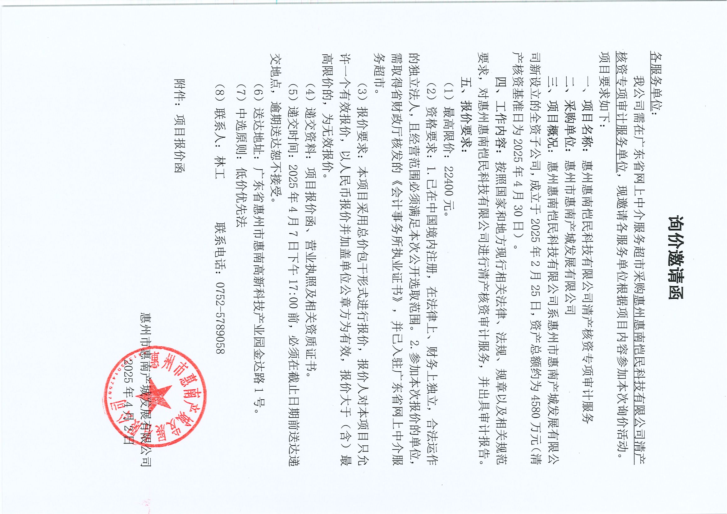 【詢價(jià)邀請函】惠州惠南愷民科技有限公司清產(chǎn)核資專項(xiàng)審計(jì)服務(wù)