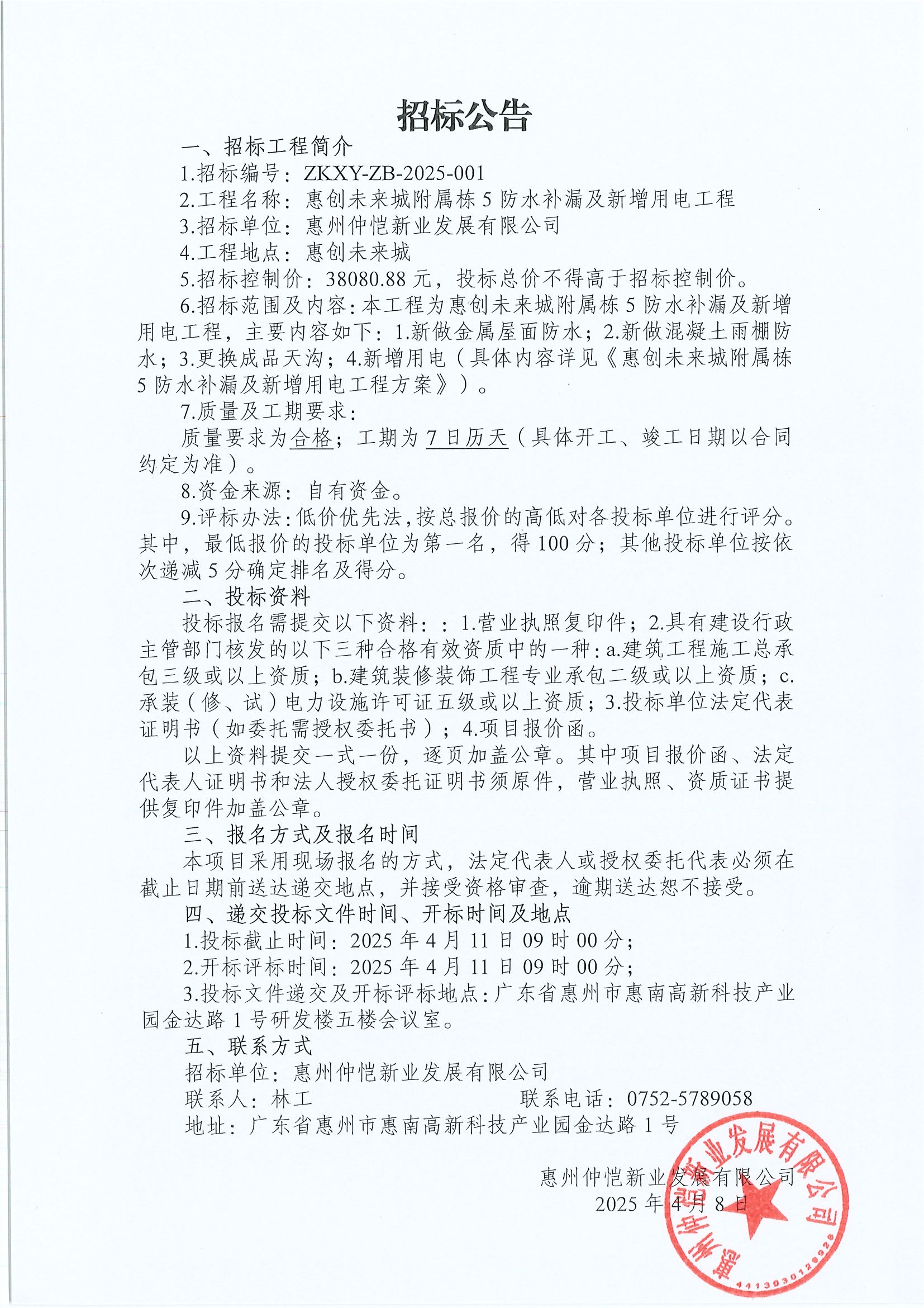 【招標(biāo)公告】惠創(chuàng)未來城附屬棟5防水補(bǔ)漏及新增用電工程