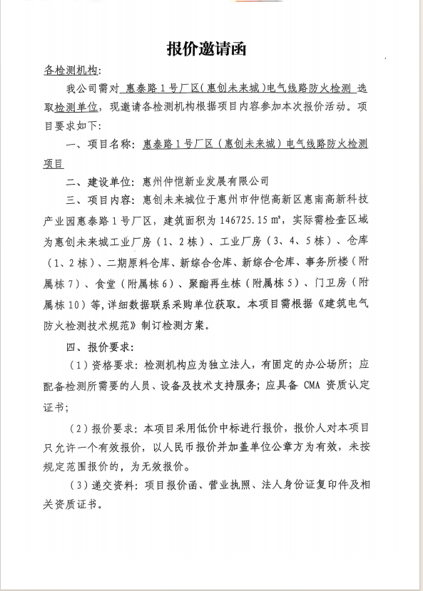 【報價邀請函】惠泰路1號廠區(qū)(惠創(chuàng)未來城)電氣線路防火檢測