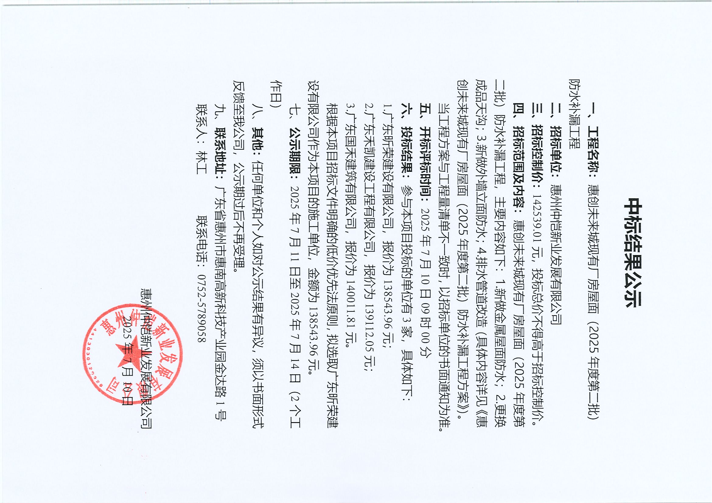 【中標(biāo)結(jié)果公示】惠創(chuàng)未來(lái)城現(xiàn)有廠(chǎng)房屋面(2025年度第二批)防水補(bǔ)漏工程