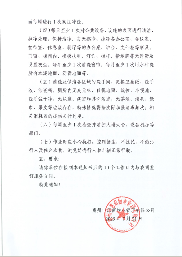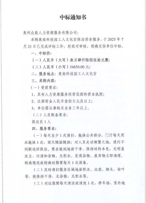 【中標(biāo)通知】惠南科技園工人文化宮保潔服務(wù)