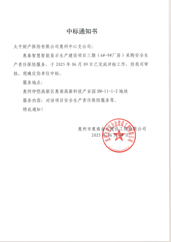 【中標(biāo)通知】惠泰智慧智能顯示生產(chǎn)建設(shè)項(xiàng)目三期(6#-9#廠房)采購(gòu)安全生產(chǎn)責(zé)任保險(xiǎn)服務(wù)
