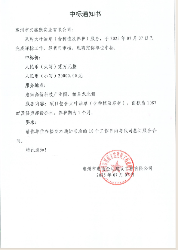【中標(biāo)通知】采購大葉油草(含種植及養(yǎng)護(hù))服務(wù)