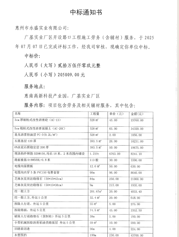 【中標(biāo)通知】廣基實(shí)業(yè)廠區(qū)開設(shè)路口工程施工勞務(wù)(含輔材)服務(wù)
