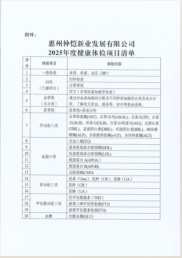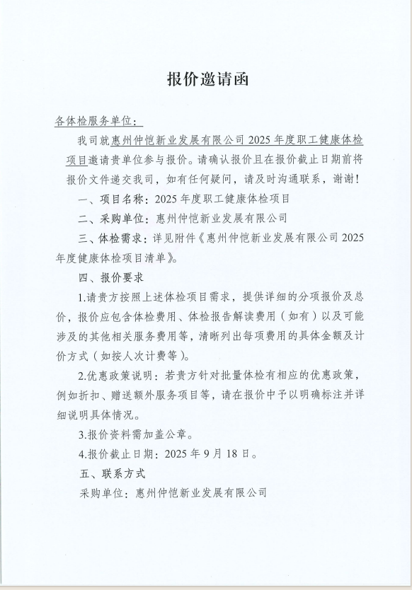 【報價邀請函】惠州仲愷新業(yè)發(fā)展有限公司2025年度職工健康體檢項目