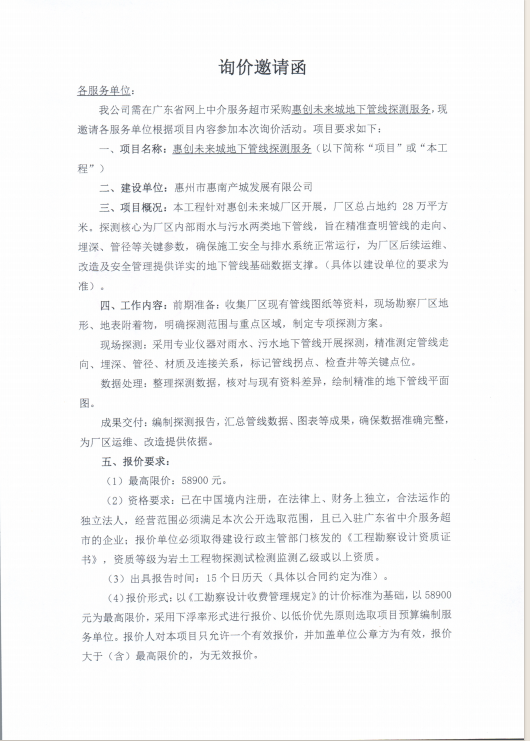 【詢價(jià)邀請(qǐng)函】惠創(chuàng)未來(lái)城地下管線探測(cè)服務(wù)