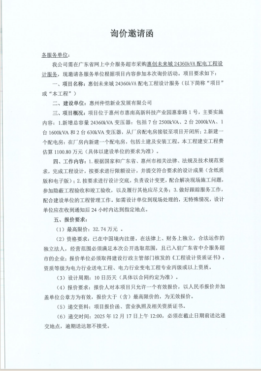 【詢價邀請函】采購惠創(chuàng)未來城24360kVA配電工程設(shè)計服務(wù)